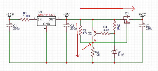 1、正常工作情況下,12V經過AMS1117,輸出電壓為5V,此時三極管Q2截止,A點電壓為R2以及R3的分壓,大概為0.87V,PMOS Vgs<-4V,PMOS導通,VCC正常供電;