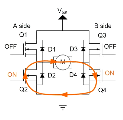 第二種:準備停止的時候,關閉Q1,打開Q2,這時候電流并不會衰減地很快,電流循環在Q2,M,Q4之間流動,通過MOSFET的內阻將電能消耗掉;