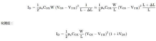當(dāng)MOS管進(jìn)入飽和區(qū)后,輸出電流并不是水平線,而是存在一定的傾斜。這是由于導(dǎo)電溝道產(chǎn)生夾斷,有效溝道長(zhǎng)度變短。
