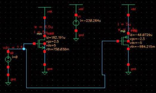 可圖中還可以看出,N管的Vth為0.75v,P管的Vth為-0.98V。與我們計算出來的值不一樣。相差0.1V左右。(我認為仿真的時候,考慮了對Vth影響的二階效應,所以造成Vth有變化)。