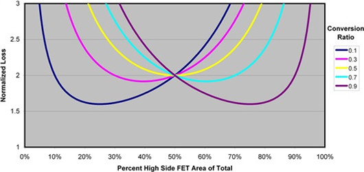 即使在極低的轉(zhuǎn)換比率條件下,F(xiàn)ET 芯片面積的很大一部分都應(yīng)該用于高側(cè) FET。高轉(zhuǎn)換比率時同樣如此;應(yīng)該有很大一部分面積用于低側(cè)。