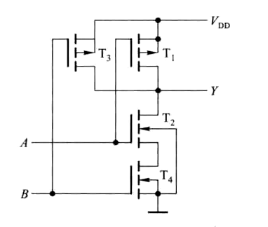 當(dāng)A=B=0時(shí),T3和T1導(dǎo)通,Y=1;