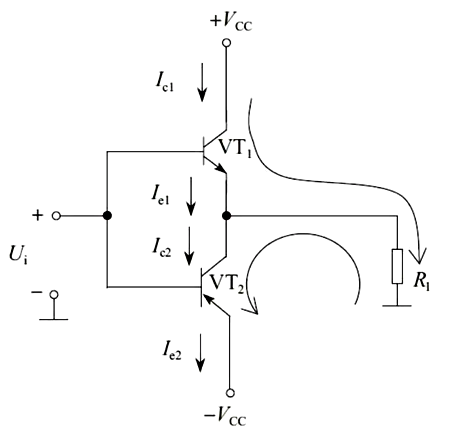該電路主要由VT1(NPN型)和VT2(PNP型)和負載組成。它由兩組正負相等的電源供電。信號是Ui,從兩管的基極輸入,負載是Rl。VT1又稱上功率輸出管,而VT2又稱下功率輸出管。