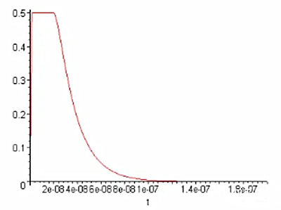 當L比較小時,此時驅(qū)動電流的峰值比較大,而一般IC的驅(qū)動電流輸出能力都是有一定限制的,當實際驅(qū)動電流達到IC輸出的最大值時,此時IC輸出相當于一個恒流源,對Cgs線性充電,驅(qū)動電壓波形的上升率會變慢。電流曲線就可能如下圖所示,這樣可能對IC的可靠性產(chǎn)生影響,電壓波形上升可能會產(chǎn)生一個小的臺階或毛刺。