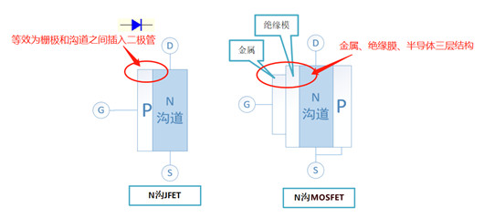 結構:由N型或P型半導體棒構成,柵極通過PN結控制溝道電流。